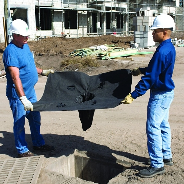 Keep sediment and other pollutants from entering stormwater drains. Oil and Sediment Model. Keep sediment, hydrocarbons and other pollutants out of the stormwater system. Large sediment accumulation pocket holds up to 18kg of silt, sediment and rubbish as well as 3.5L of oil and grease. Built-in overflow ports avoid flooding in heavy rain events. Sewn-in, lift-out straps make removal easy and prevent the Drain Guard from falling into the inlet. One size fits most drains. Simply lift grate, insert Drain Guard and replace grate to hold Drain Guard in place. Trim excess fabric if desired. Drain Guards are made from a polypropylene geotextile. Dimensions: 1,220mm (L) x 910mm (W) x 460mm (H). Performance: Removes up to 3.5L of oil and 18kg of sediment. Exceeds 75% TSS removal.