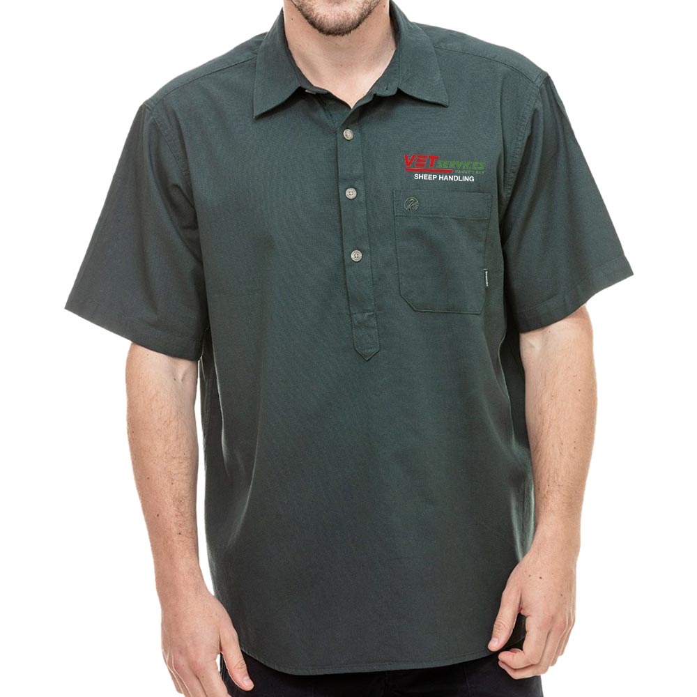 100% cotton, 134gsm. Panama weave fabric for breathability. Relaxed fit. Half placket button opening. Left chest pocket. Back pleats. Embroidered swan logo