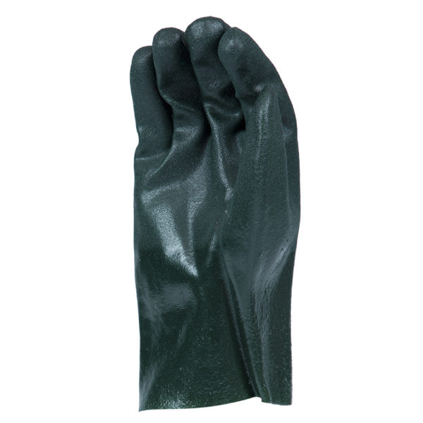 FEATURES. Dark green double dipped PVC glove with jersey liner. Sandy finish on the palm provides excellent grip in oily conditions. Jersey liner for comfort and heat resistance.