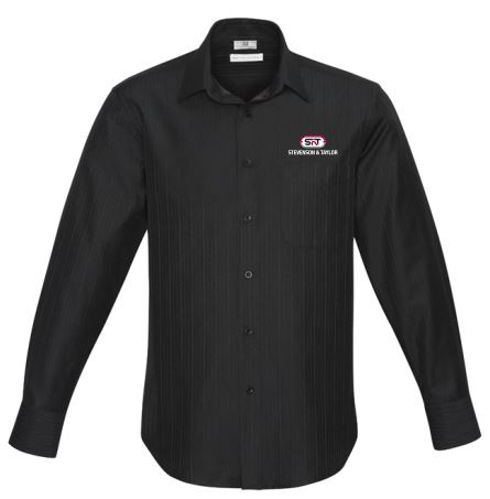 Easy Care, easy iron, 65% Polyester, 35% Cotton. Self stripe pattern with new modern narrow collar style. Twin back shoulder pleats for movement. Adjustable 2 button cuff
