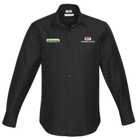 Easy Care, easy iron, 65% Polyester, 35% Cotton. Self stripe pattern with new modern narrow collar style. Twin back shoulder pleats for movement. Adjustable 2 button cuff